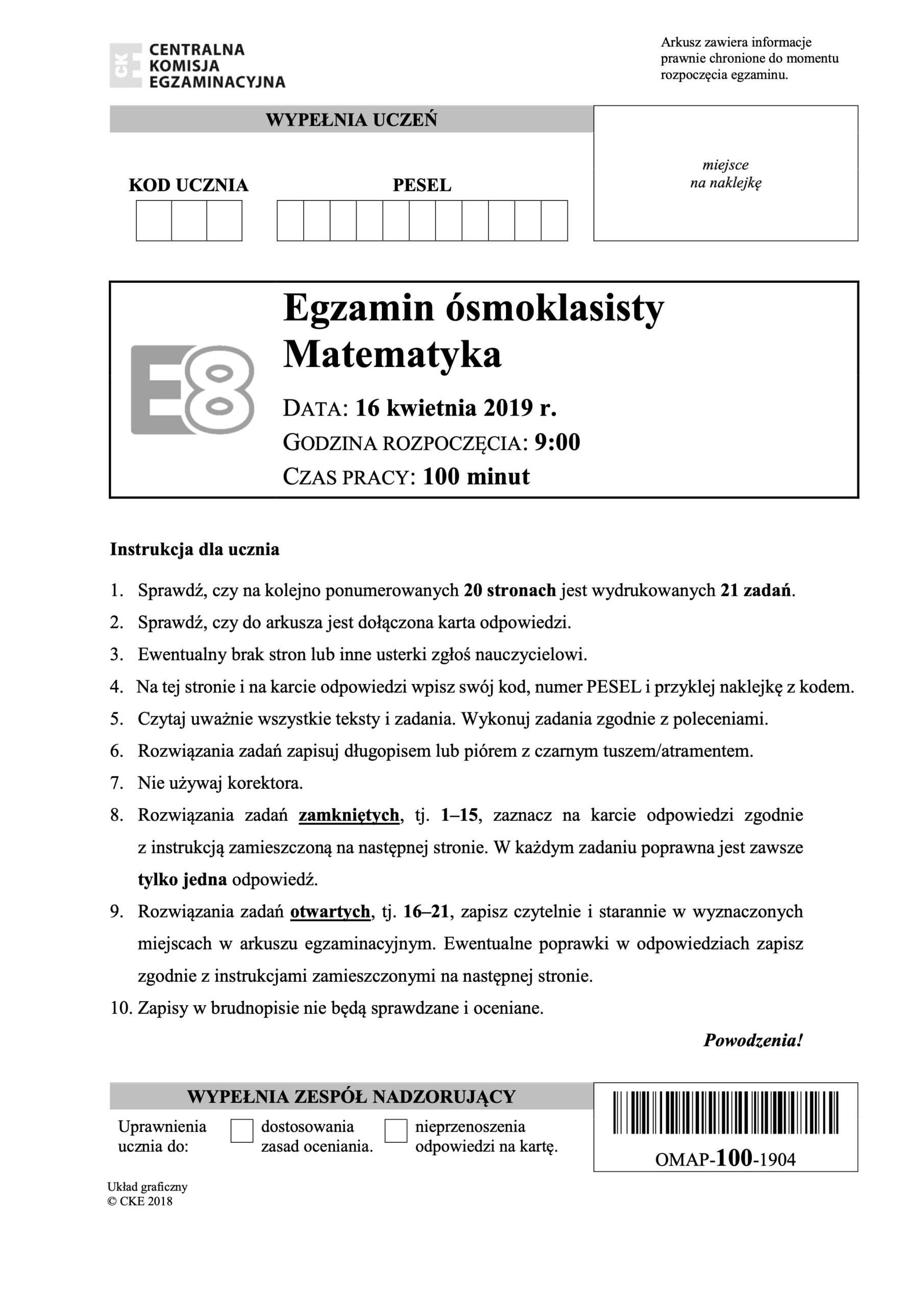 Arkusz egzaminacyjny matematyka, kwiecień 2019.